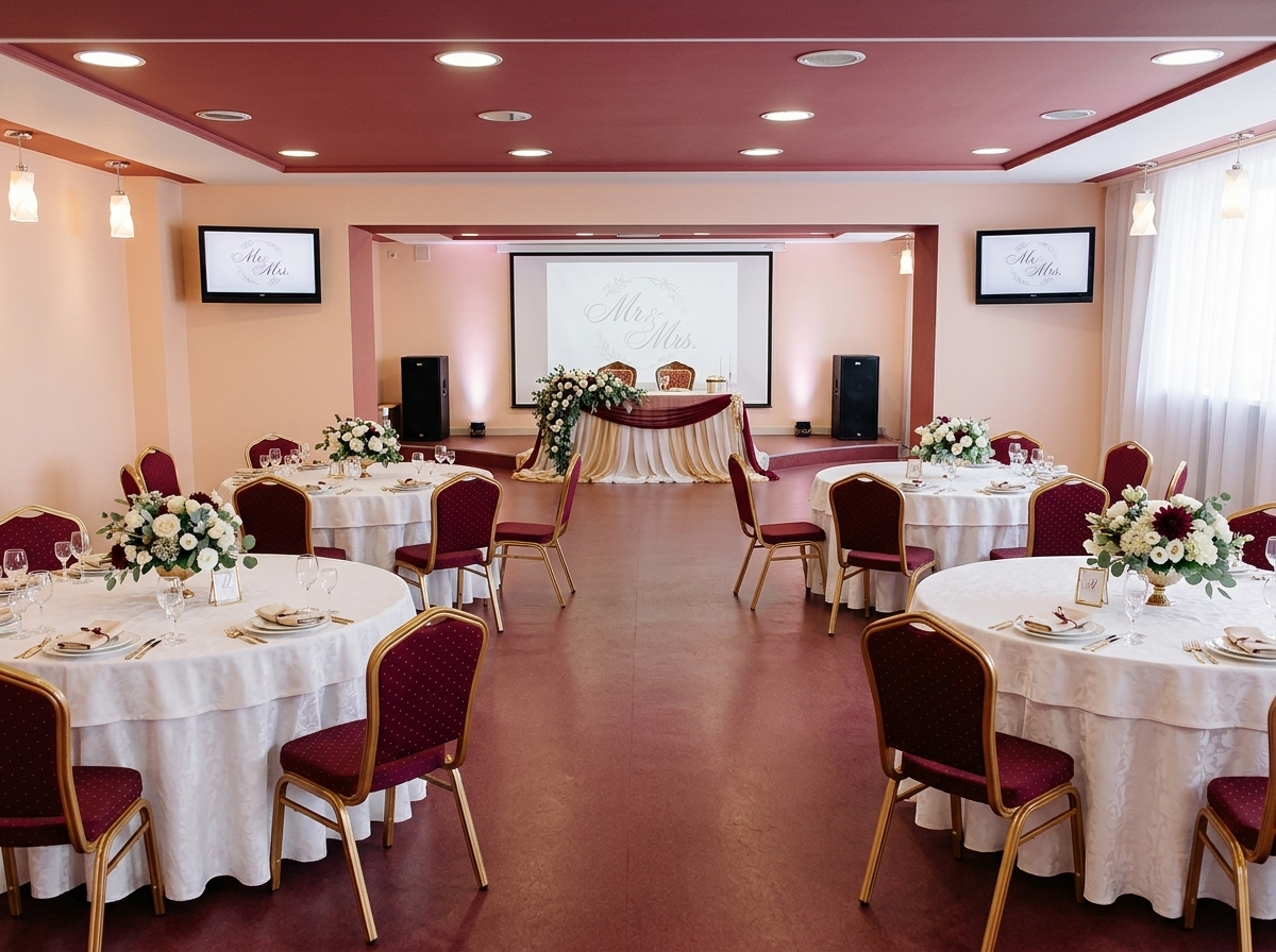 любого декора. Есть возможность организации пространства для танцпола и сцены.